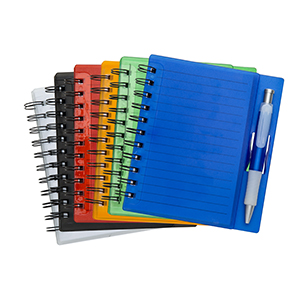 Bloco de anotações com caneta e suporte para encaixe, bloco com wire-o e caneta plástica com detalhe emborrachado, carga esferográfica na cor azul e acionamento por clique. Personalização Silk 1 cor na caneta e silk 1 cor no bloco